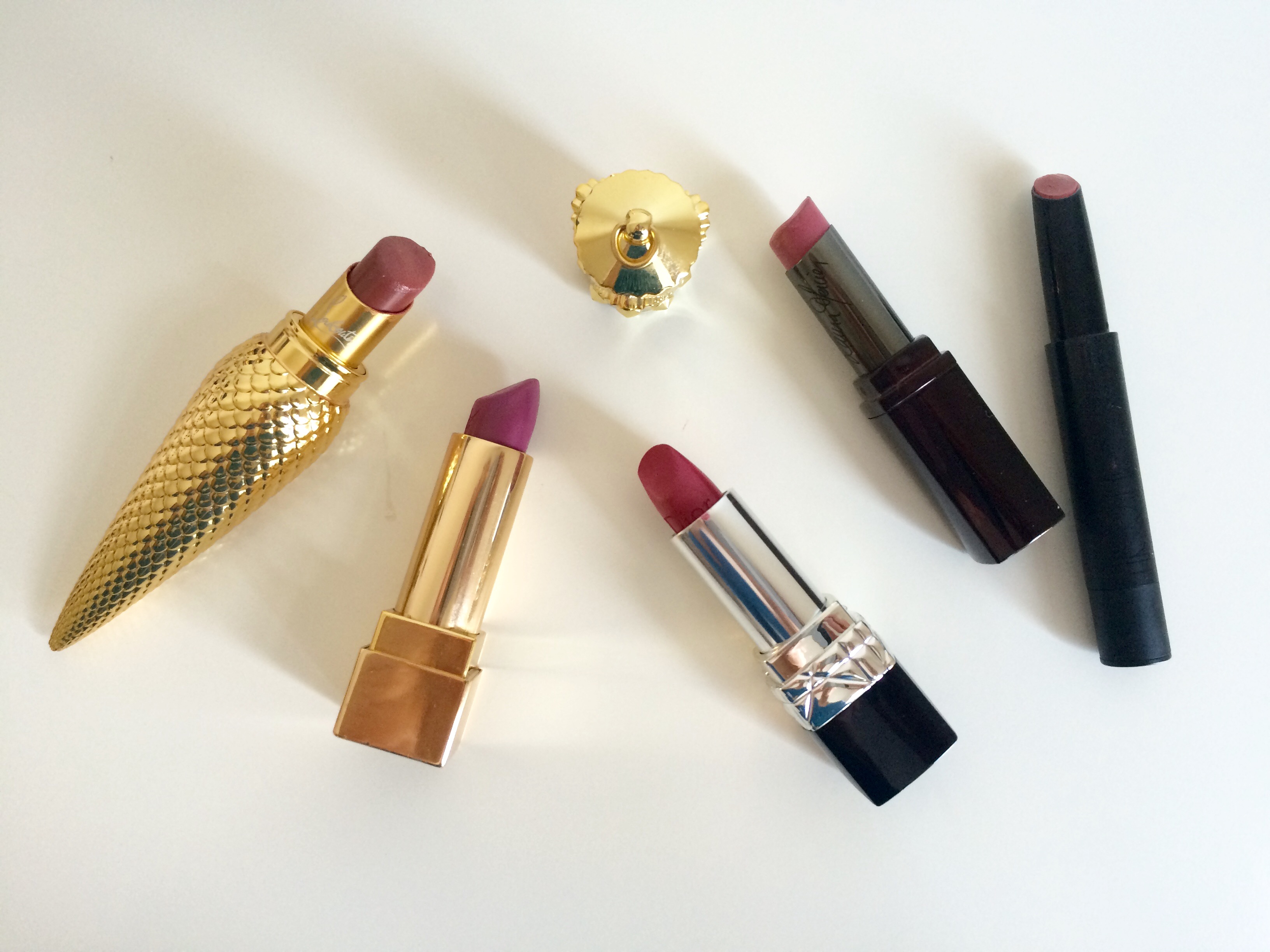 Louboutin Rose du Desert, YSL Mauve Nihiliste, Dior Culte, LM Raspberry Ripple, Surratt Hevyn.